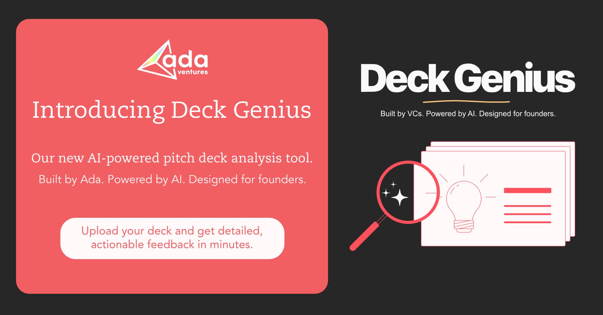 Advancements and innovations were also occurring within the Ada team during 2025. Our Principal and Head of Product, Michael Tefula, designed, built and launched AdaGPT and its most recent iteration, Deck Genius. The tools enable founders to get instant, anonymous feedback on their decks. AdaGPT was used by over 1,000 founders. And the new, improved platform - DeckGenius - has rapidly surpassed these figures: with 1,091 decks run through the system within three weeks of launch. You can read about the launch here.