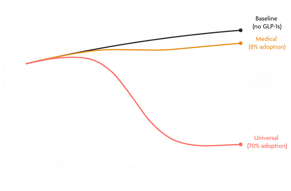 However, without significant innovation in access, policy, and cost, this potential will be squandered. Projections show two remarkably different futures. The first is a baseline scenario where obesity rates continue their relentless climb. The alternative futures, however, show that with broader adoption of GLP-1s, we can fundamentally reverse this trend.